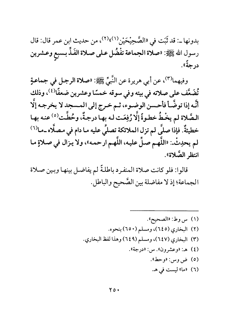 قالوا: فلو كانت صلاة المنفرد باطلةً لم يفاضل بينها وبين صلاة الجماعة؛ إذ لا مفاضلة بين الصَّحيح والباطل.