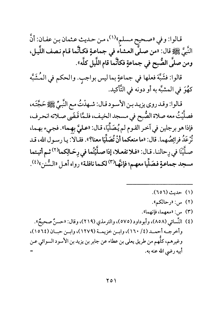 قالوا: وفي «صحيح مسلمٍ» (¬١)، من حديث عثمان بن عفان: أنَّ النَّبيَّ - صلى الله عليه وسلم - قال: «من صلَّى العشاء في جماعةٍ فكأنَّما قام نصف اللَّيل، ومن صلَّى الصُّبح في جماعةٍ فكأنَّما قام اللَّيل كلَّه».
