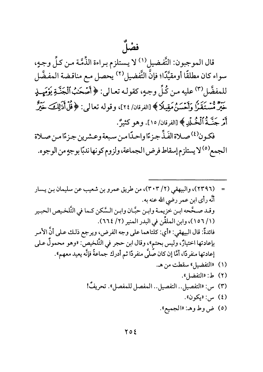 قال الموجبون: التَّفضيل (¬١) لا يستلزم براءة الذِّمَّة من كلِّ وجهٍ، سواء كان مطلقًا أومقيَّدًا؛ فإنَّ التَّفضيل (¬٢) يحصل مع مناقضة المفضَّل للمفضَّل (¬٣) عليه من كُلِّ وجهٍ، كقوله تعالى: {أَصْحَابُ الْجَنَّةِ يَوْمَئِذٍ خَيْرٌ مُسْتَقَرًّا وَأَحْسَنُ مَقِيلًا} [الفرقان/٢٤]، وقوله تعالى: {قُلْ أَذَلِكَ خَيْرٌ أَمْ جَنَّةُ الْخُلْدِ} [الفرقان/١٥]. وهو كثيرٌ.