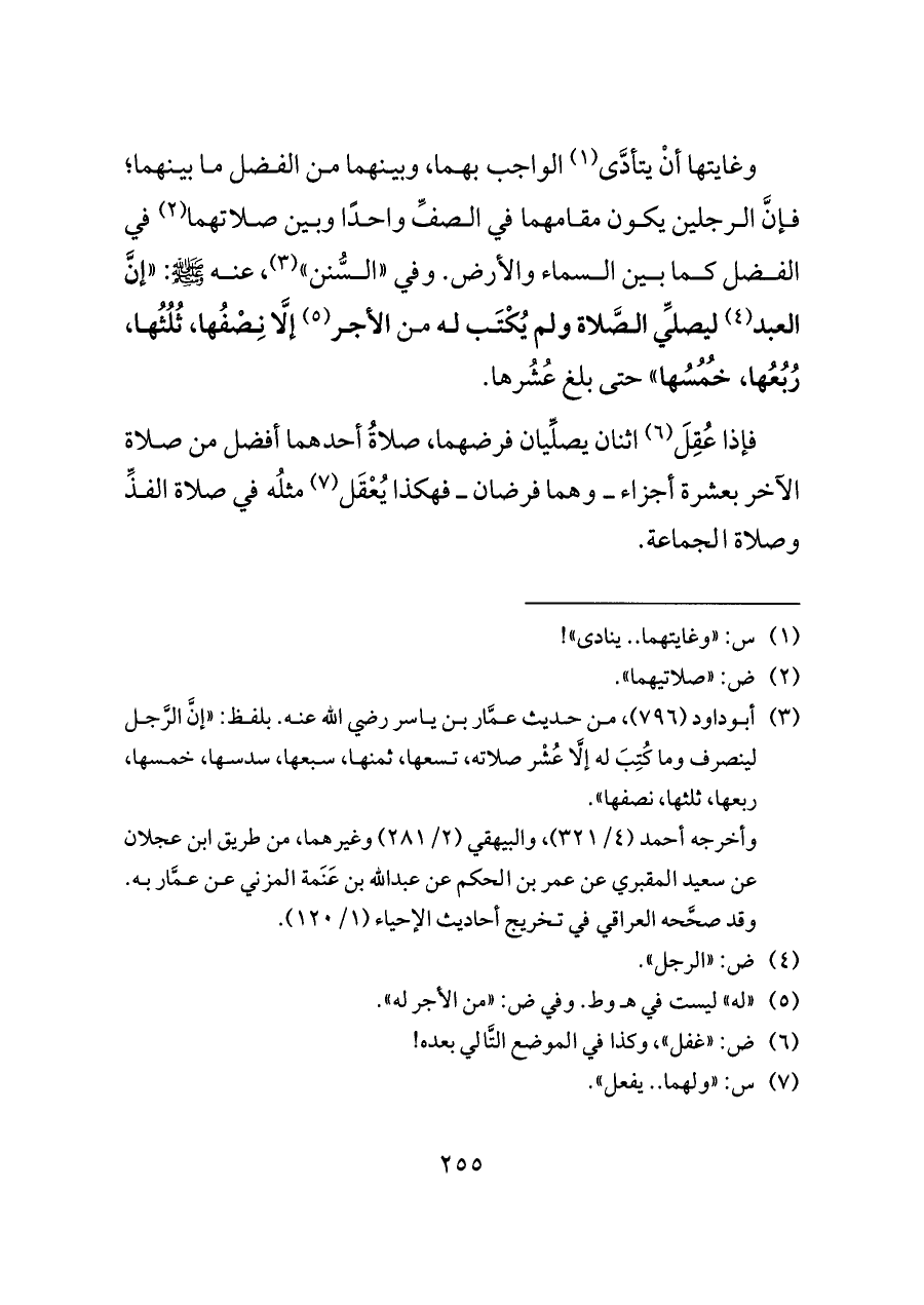وغايتها أنْ يتأدَّى (¬١) الواجب بهما، وبينهما من الفضل ما بينهما؛ فإنَّ الرجلين يكون مقامهما في الصفِّ واحدًا وبين صلاتهما (¬٢) في الفضل كما بين السماء والأرض. وفي «السُّنن» (¬٣)، عنه - صلى الله عليه وسلم -: «إنَّ العبد (¬٤) ليصلِّي الصَّلاة ولم يُكْتَب له من الأجر (¬٥) إلَّا نِصْفُها، ثُلُثُها، رُبُعُها، خُمُسُها» حتى بلغ عُشُرها.