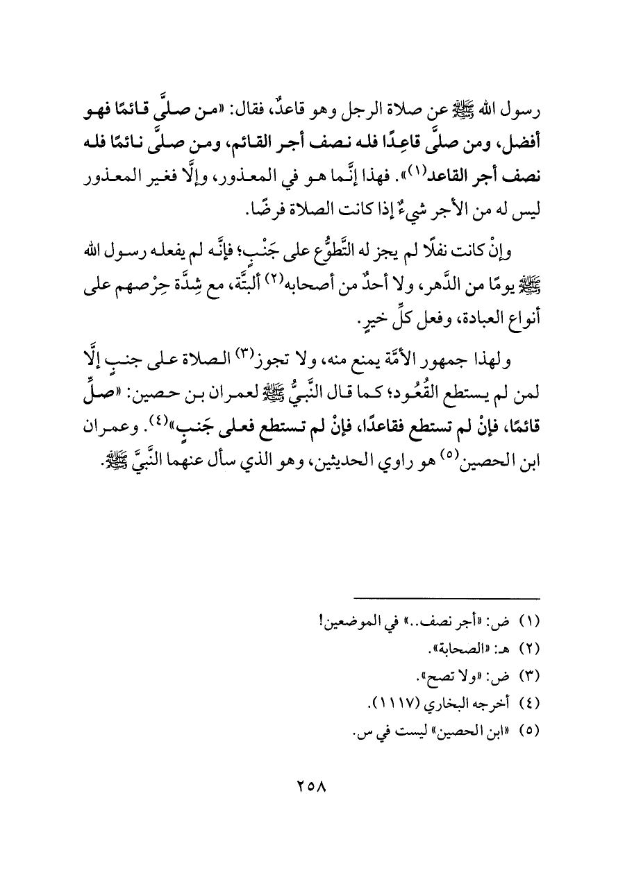 ولهذا جمهور الأمَّة يمنع منه، ولا تجوز (¬٣) الصلاة على جنبٍ إلَّا لمن لم يستطع القُعُود؛ كما قال النَّبيُّ - صلى الله عليه وسلم - لعمران بن حصين: «صلِّ قائمًا، فإنْ لم تستطع فقاعدًا، فإنْ لم تستطع فعلى جَنبٍ» (¬٤). وعمران ابن الحصين (¬٥) هو راوي الحديثين، وهو الذي سأل عنهما النَّبيَّ - صلى الله عليه وسلم -.
