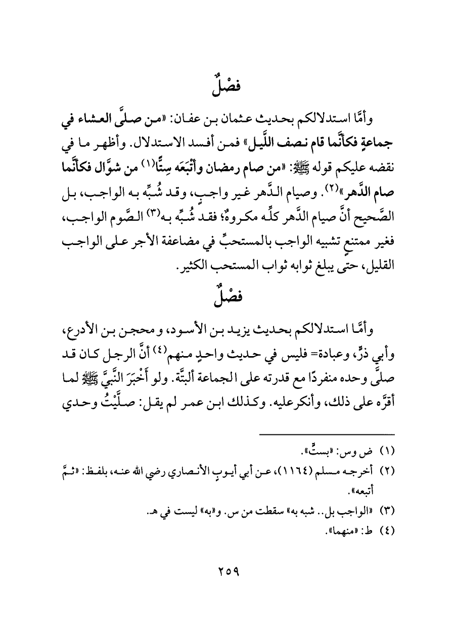 وأمَّا استدلالكم بحديث عثمان بن عفان: «من صلَّى العشاء في جماعةٍ فكأنَّما قام نصف اللَّيل» فمن أفسد الاستدلال. وأظهر ما في نقضه عليكم قوله - صلى الله عليه وسلم -: «من صام رمضان وأتْبَعَه سِتًّا (¬١) من شوَّال فكأنَّما صام الدَّهر» (¬٢). وصيام الدَّهر غير واجبٍ، وقد شُبِّه به الواجب، بل الصَّحيح أنَّ صيام الدَّهر كلِّه مكروهٌ؛ فقد شُبِّه به (¬٣) الصَّوم الواجب، فغير ممتنعٍ تشبيه الواجب بالمستحبِّ في مضاعفة الأجر على الواجب القليل، حتى يبلغ ثوابه ثواب المستحب الكثير.