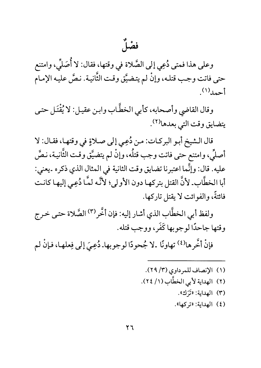 قال الشيخ أبو البركات: من دُعِي إلى صلاةٍ في وقتها، فقال: لا أصلِّي، وامتنع حتى فاتت وجب قتلُه، وإنْ لم يتضيَّق وقت الثَّانية، نصَّ عليه. قال: وإنَّما اعتبرنا تضايق وقت الثانية في المثال الذي ذكره ـ يعني: أبا الخطَّاب ـ لأنَّ القتل بتركها دون الأولى؛ لأنَّه لمَّا دُعِي إليها كانت فائتةً، والفوائت لا يقتل تاركها.