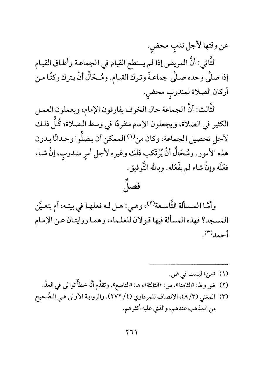 الثَّاني: أنَّ المريض إذا لم يستطع القيام في الجماعة وأطاق القيام إذا صلَّى وحده صلَّى جماعةً وترك القيام. ومُحَالٌ أنْ يترك ركنًا من أركان الصلاة لمندوبٍ محضٍ.