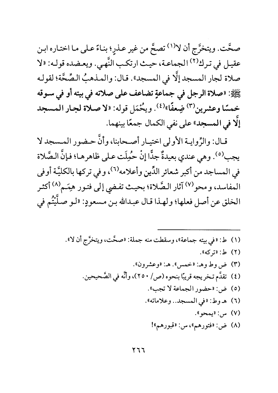 قال: والرِّواية الأولى اختيار أصحابنا، وأنَّ حضور المسجد لا يجب (¬٥). وهي عندي بعيدةٌ جدًّا إنْ حُمِلَت على ظاهرها؛ فإنَّ الصَّلاة في المساجد من أكبر شعائر الدِّين وأعلامه (¬٦)، وفي تركها بالكليَّة أوفى المفاسد، ومحو (¬٧) آثار الصَّلاة؛ بحيث تفضي إلى فتور هِمَم (¬٨) أكثر الخلق عن أصل فعلها؛ ولهذا قال عبدالله بن مسعودٍ: «لو صلَّيْتُم في