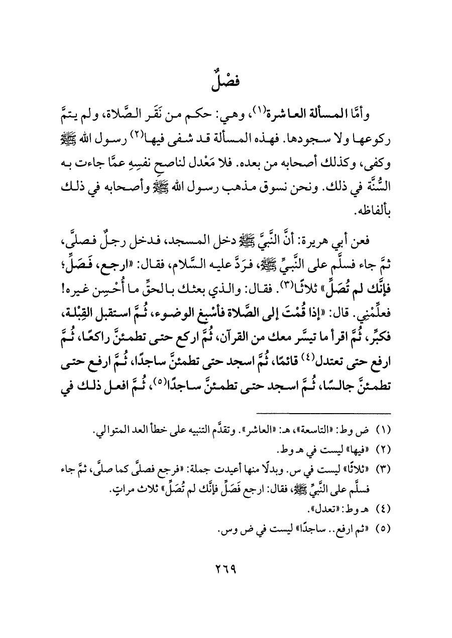 وأمَّا المسألة العاشرة (¬١)، وهي: حكم من نَقَر الصَّلاة، ولم يتمَّ ركوعها ولا سجودها. فهذه المسألة قد شفى فيها (¬٢) رسول الله - صلى الله عليه وسلم - وكفى، وكذلك أصحابه من بعده. فلا مَعْدل لناصحِ نفسِهِ عمَّا جاءت به السُّنَّة في ذلك. ونحن نسوق مذهب رسول الله - صلى الله عليه وسلم - وأصحابه في ذلك بألفاظه.
