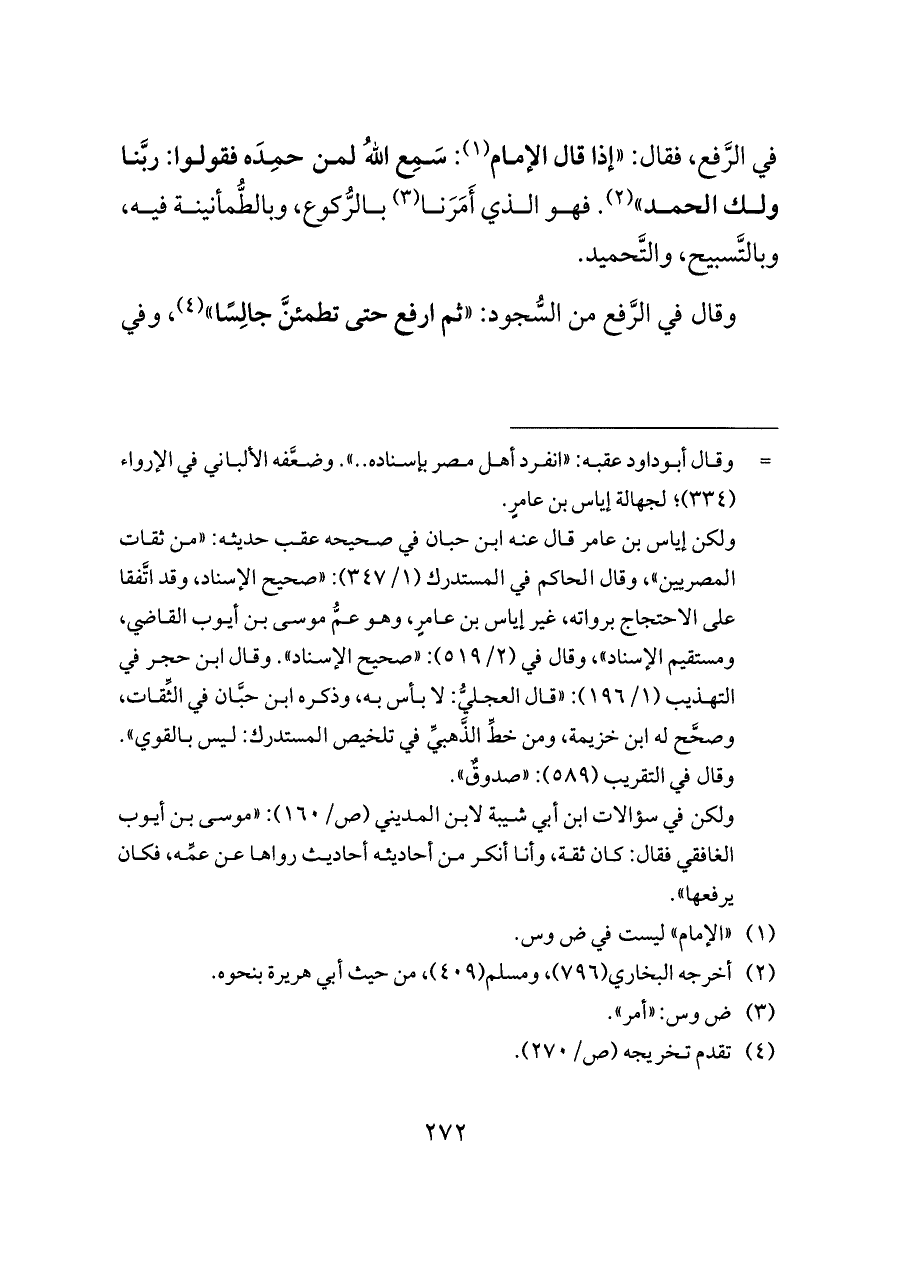 وقال في الرَّفع من السُّجود: «ثم ارفع حتى تطمئنَّ جالِسًا» (¬٤)، وفي
