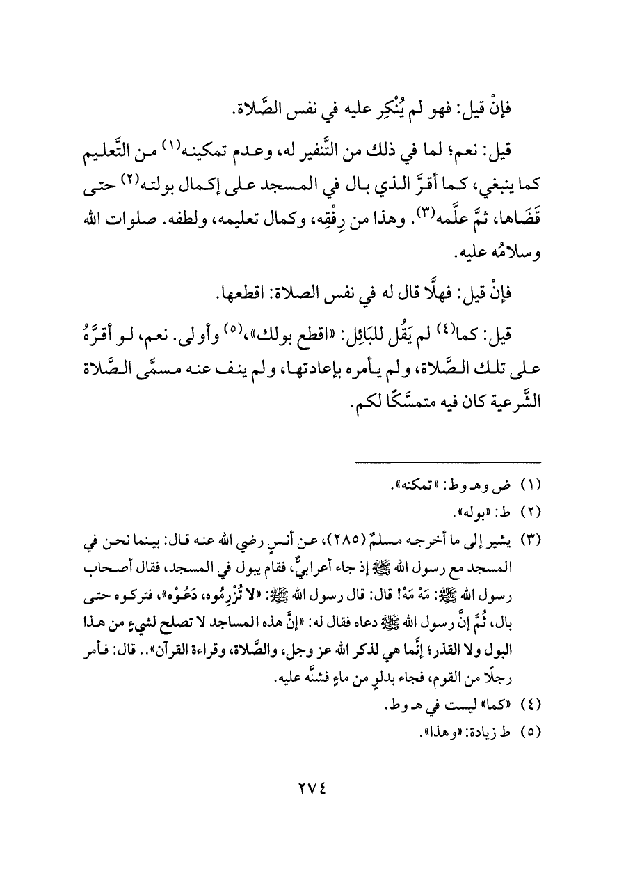 (¬٣) يشير إلى ما أخرجه مسلمٌ (٢٨٥)، عن أنسٍ رضي الله عنه قال: بينما نحن في المسجد مع رسول الله - صلى الله عليه وسلم - إذ جاء أعرابيٌّ، فقام يبول في المسجد، فقال أصحاب رسول الله - صلى الله عليه وسلم -: مَهْ مَهْ! قال: قال رسول الله - صلى الله عليه وسلم -: «لا تُزْرِمُوه، دَعُوْه»، فتركوه حتى بال، ثُمَّ إنَّ رسول الله - صلى الله عليه وسلم - دعاه فقال له: «إنَّ هذه المساجد لا تصلح لشيءٍ من هذا البول ولا القذر؛ إنَّما هي لذكر الله عز وجل، والصَّلاة، وقراءة القرآن» .. قال: فأمر رجلًا من القوم، فجاء بدلوٍ من ماءٍ فشنَّه عليه.