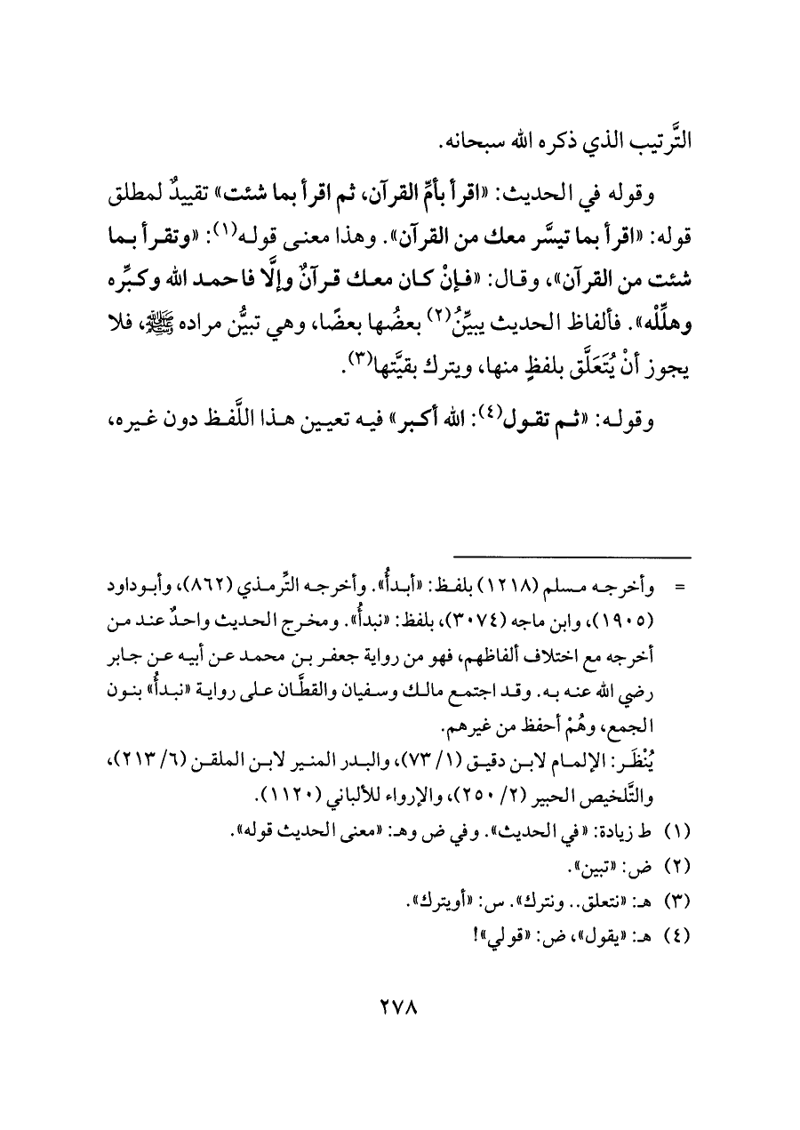 وقوله في الحديث: «اقرأ بأمِّ القرآن، ثم اقرأ بما شئت» تقييدٌ لمطلق قوله: «اقرأ بما تيسَّر معك من القرآن». وهذا معنى قوله (¬١): «وتقرأ بما شئت من القرآن»، وقال: «فإنْ كان معك قرآنٌ وإلَّا فاحمد الله وكبِّره وهلِّلْه». فألفاظ الحديث يبيِّنُ (¬٢) بعضُها بعضًا، وهي تبيُّن مراده - صلى الله عليه وسلم -، فلا يجوز أنْ يُتَعَلَّق بلفظٍ منها، ويترك بقيَّتها (¬٣).
