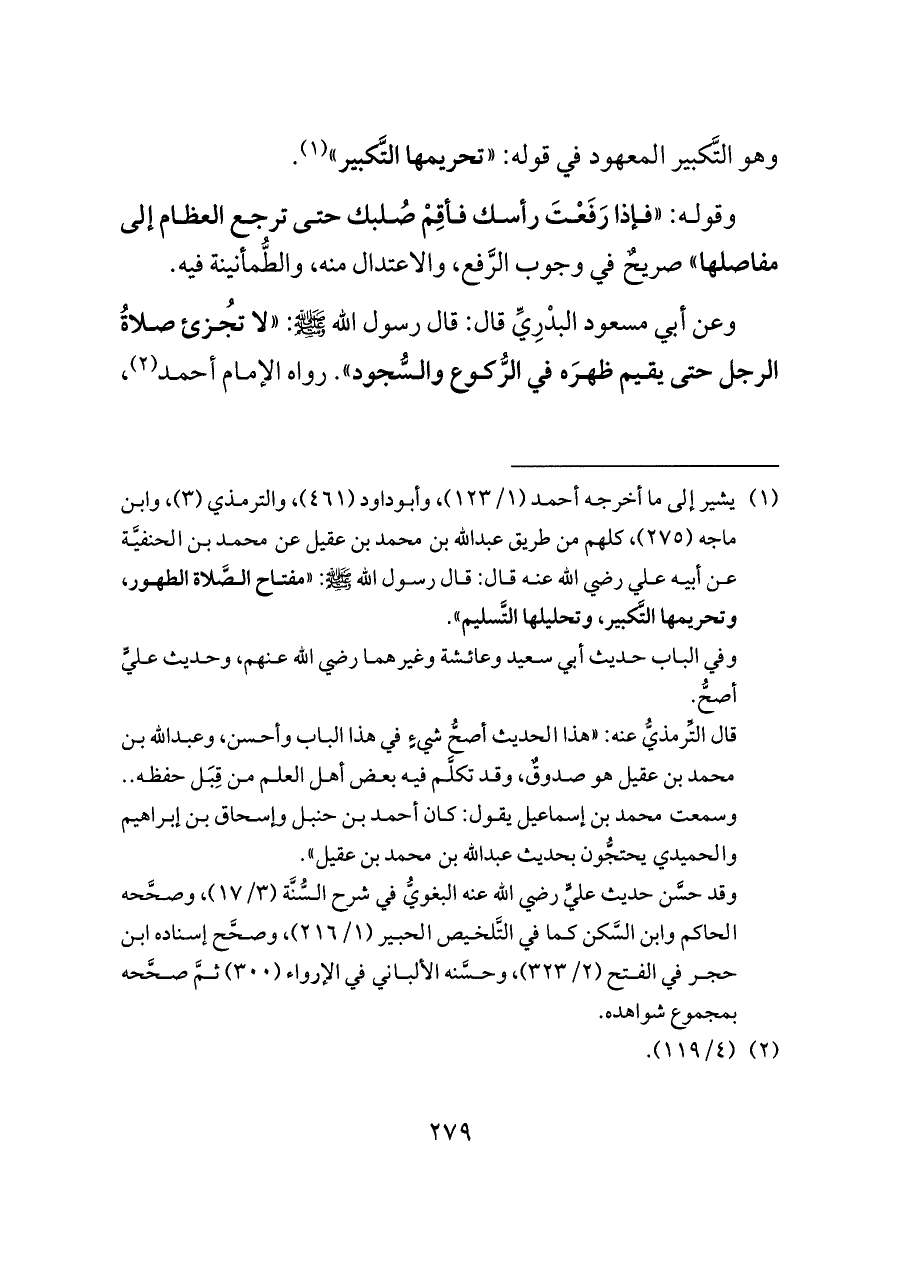 وعن أبي مسعود البدْرِيِّ قال: قال رسول الله - صلى الله عليه وسلم -: «لا تُجزئ صلاةُ الرجل حتى يقيم ظهرَه في الرُّكوع والسُّجود». رواه الإمام أحمد (¬٢)،