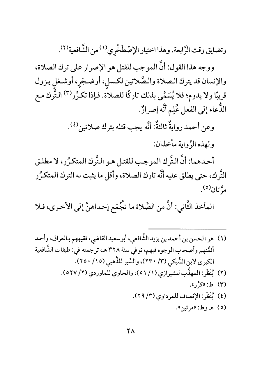 أحدهما: أنَّ التَّرك الموجب للقتل هو التَّرك المتكرِّر، لا مطلق التَّرك، حتى يطلق عليه أنَّه تارك الصلاة، وأقل ما يثبت به الترك المتكرِّر مرَّتان (¬٥).