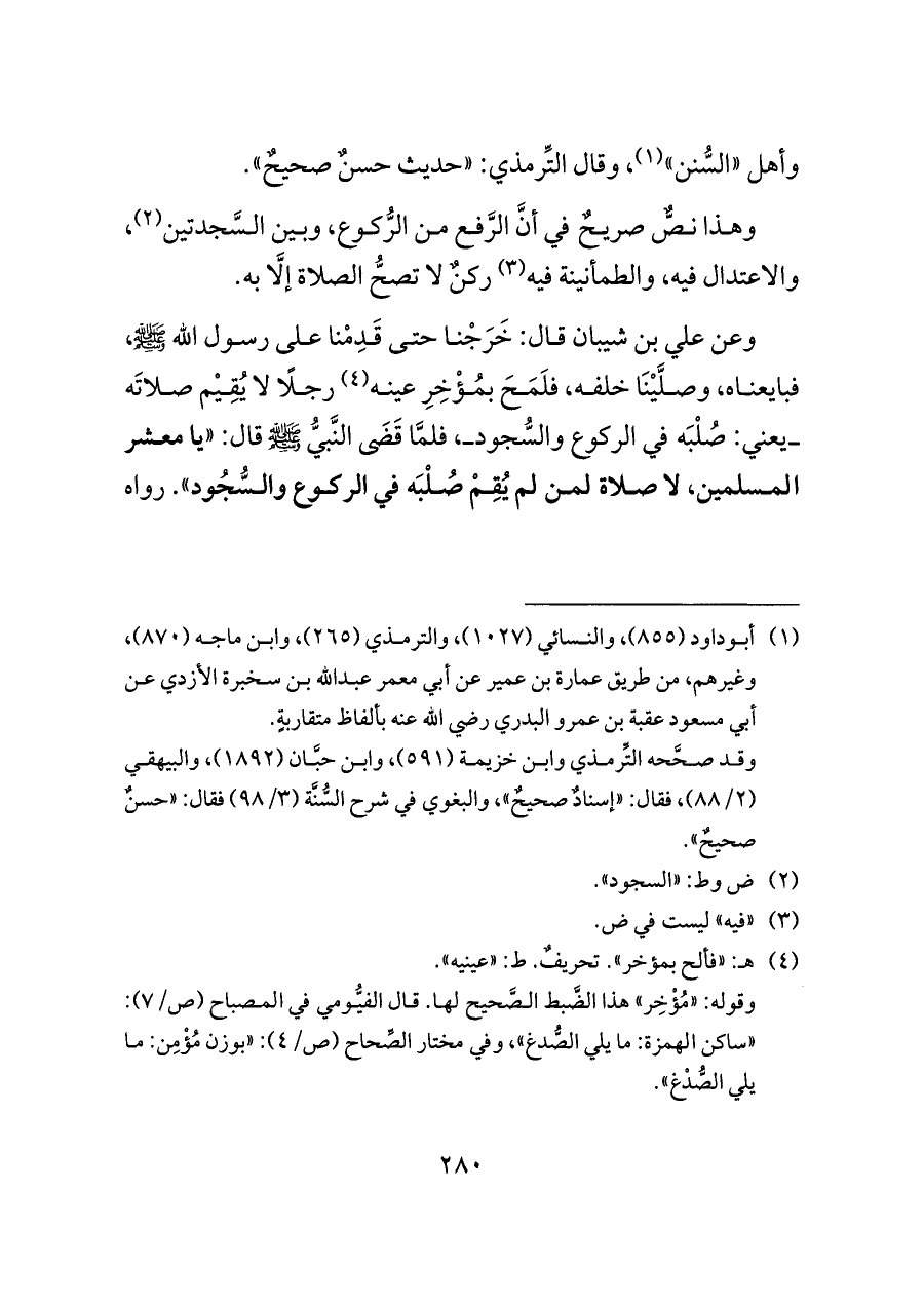 (¬١) أبوداود (٨٥٥)، والنسائي (١٠٢٧)، والترمذي (٢٦٥)، وابن ماجه (٨٧٠)، وغيرهم، من طريق عمارة بن عمير عن أبي معمر عبدالله بن سخبرة الأزدي عن أبي مسعود عقبة بن عمرو البدري رضي الله عنه بألفاظ متقاربةٍ.