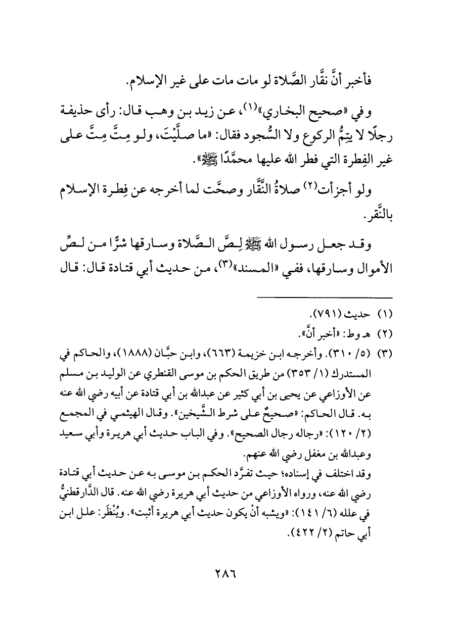 وفي «صحيح البخاري» (¬١)، عن زيد بن وهب قال: رأى حذيفة رجلًا لا يتِمُّ الركوع ولا السُّجود فقال: «ما صلَّيْتَ، ولو مِتَّ مِتَّ على غير الفِطرة التي فطر الله عليها محمَّدًا - صلى الله عليه وسلم -».