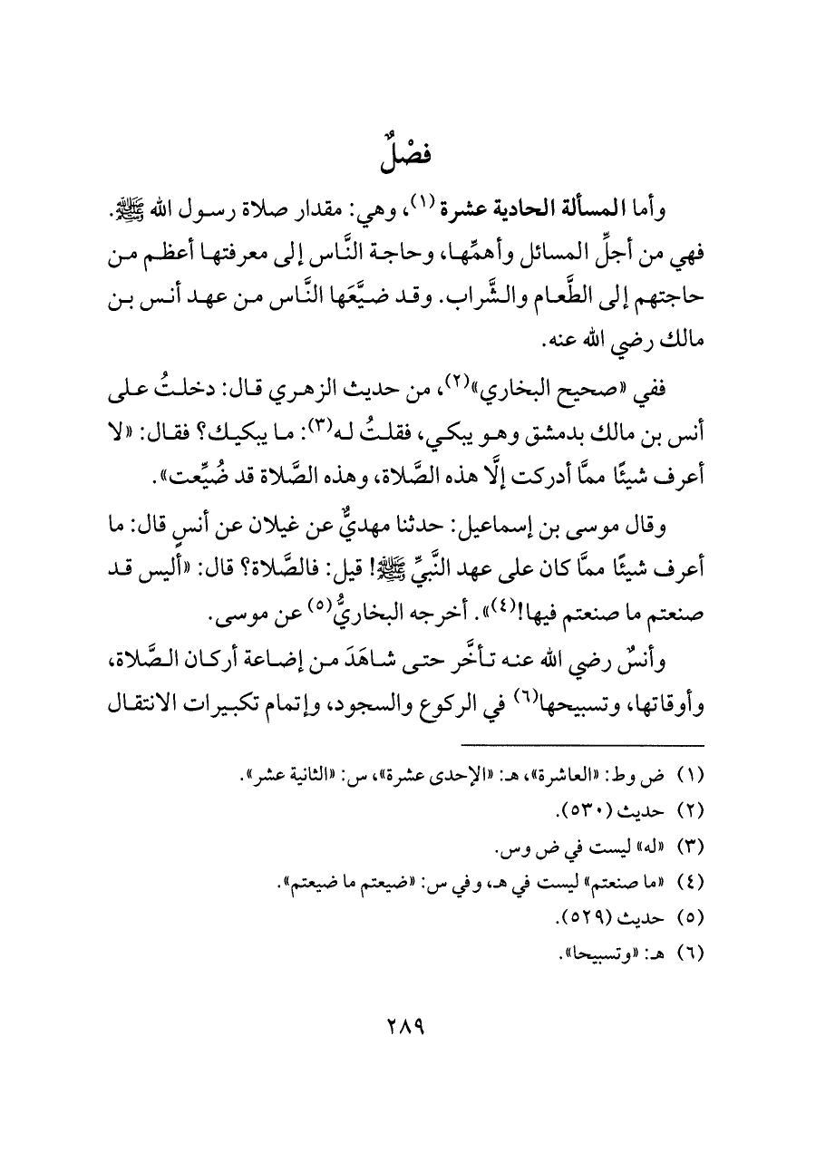 وأما المسألة الحادية عشرة (¬١)، وهي: مقدار صلاة رسول الله - صلى الله عليه وسلم -. فهي من أجلِّ المسائل وأهمِّها، وحاجة النَّاس إلى معرفتها أعظم من حاجتهم إلى الطَّعام والشَّراب. وقد ضيَّعَها النَّاس من عهد أنس بن مالك رضي الله عنه.