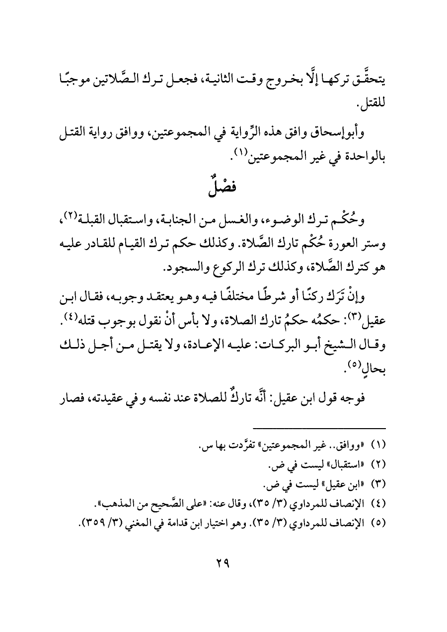 وإنْ تَرَك ركنًا أو شرطًا مختلفًا فيه وهو يعتقد وجوبه، فقال ابن عقيل (¬٣): حكمُه حكمُ تارك الصلاة، ولا بأس أنْ نقول بوجوب قتله (¬٤). وقال الشيخ أبو البركات: عليه الإعادة، ولا يقتل من أجل ذلك بحالٍ (¬٥).