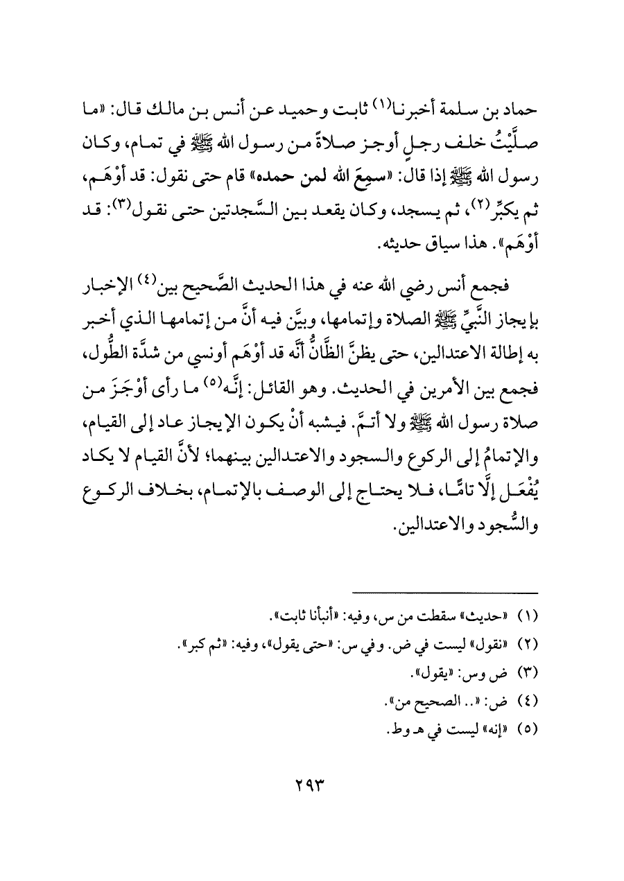 حماد بن سلمة أخبرنا (¬١) ثابت وحميد عن أنس بن مالك قال: «ما صلَّيْتُ خلف رجلٍ أوجز صلاةً من رسول الله - صلى الله عليه وسلم - في تمام، وكان رسول الله - صلى الله عليه وسلم - إذا قال: «سمِعَ الله لمن حمده» قام حتى نقول: قد أوْهَم، ثم يكبِّر (¬٢)، ثم يسجد، وكان يقعد بين السَّجدتين حتى نقول (¬٣): قد أوْهَم». هذا سياق حديثه.