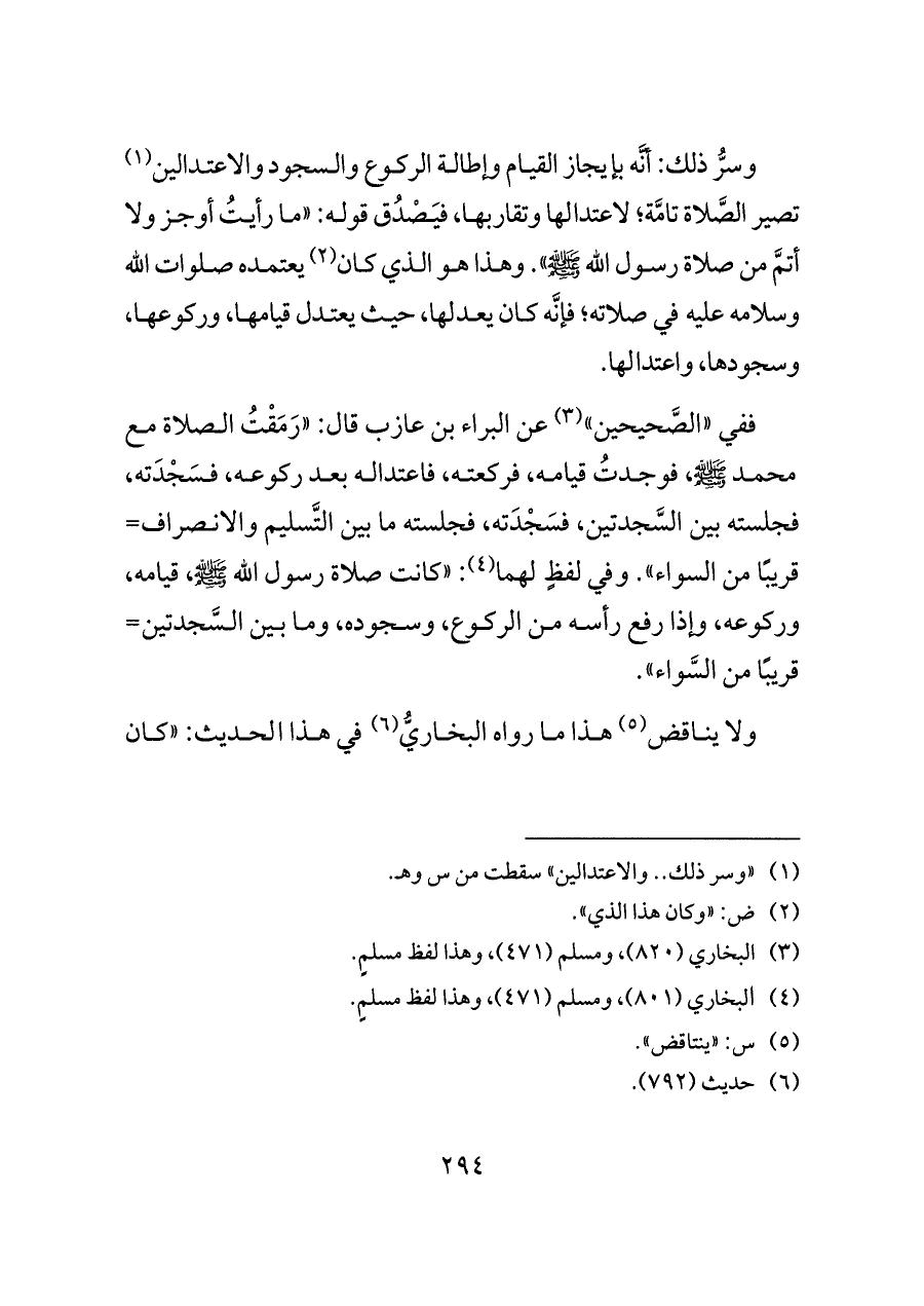 ففي «الصَّحيحين» (¬٣) عن البراء بن عازب قال: «رَمَقْتُ الصلاة مع محمد - صلى الله عليه وسلم -، فوجدتُ قيامه، فركعته، فاعتداله بعد ركوعه، فسَجْدَته، فجلسته بين السَّجدتين، فسَجْدَته، فجلسته ما بين التَّسليم والانصراف= قريبًا من السواء». وفي لفظٍ لهما (¬٤): «كانت صلاة رسول الله - صلى الله عليه وسلم -، قيامه، وركوعه، وإذا رفع رأسه من الركوع، وسجوده، وما بين السَّجدتين= قريبًا من السَّواء».
