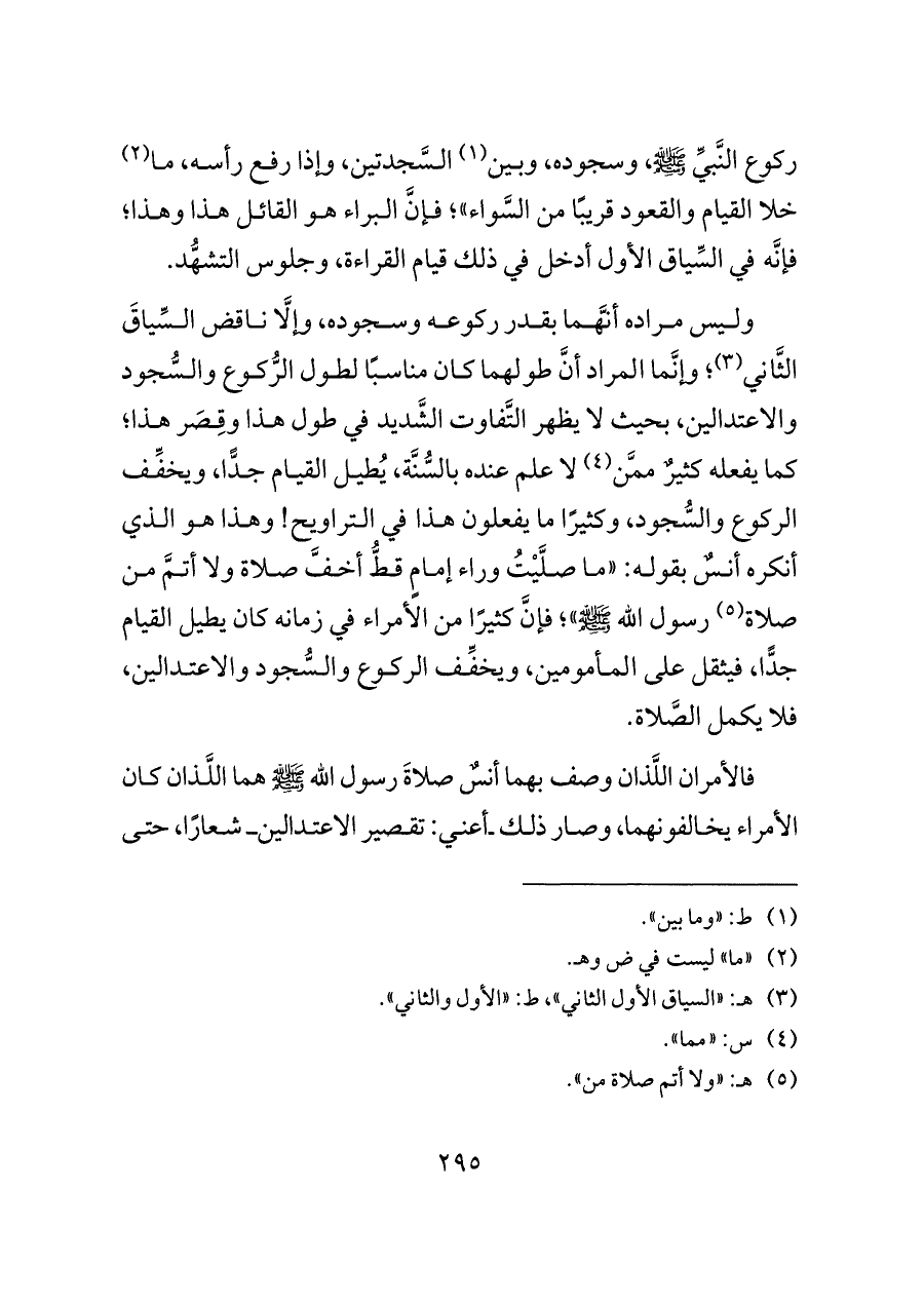 فالأمران اللَّذان وصف بهما أنسٌ صلاةَ رسول الله - صلى الله عليه وسلم - هما اللَّذان كان الأمراء يخالفونهما، وصار ذلك ـ أعني: تقصير الاعتدالين ـ شعارًا، حتى