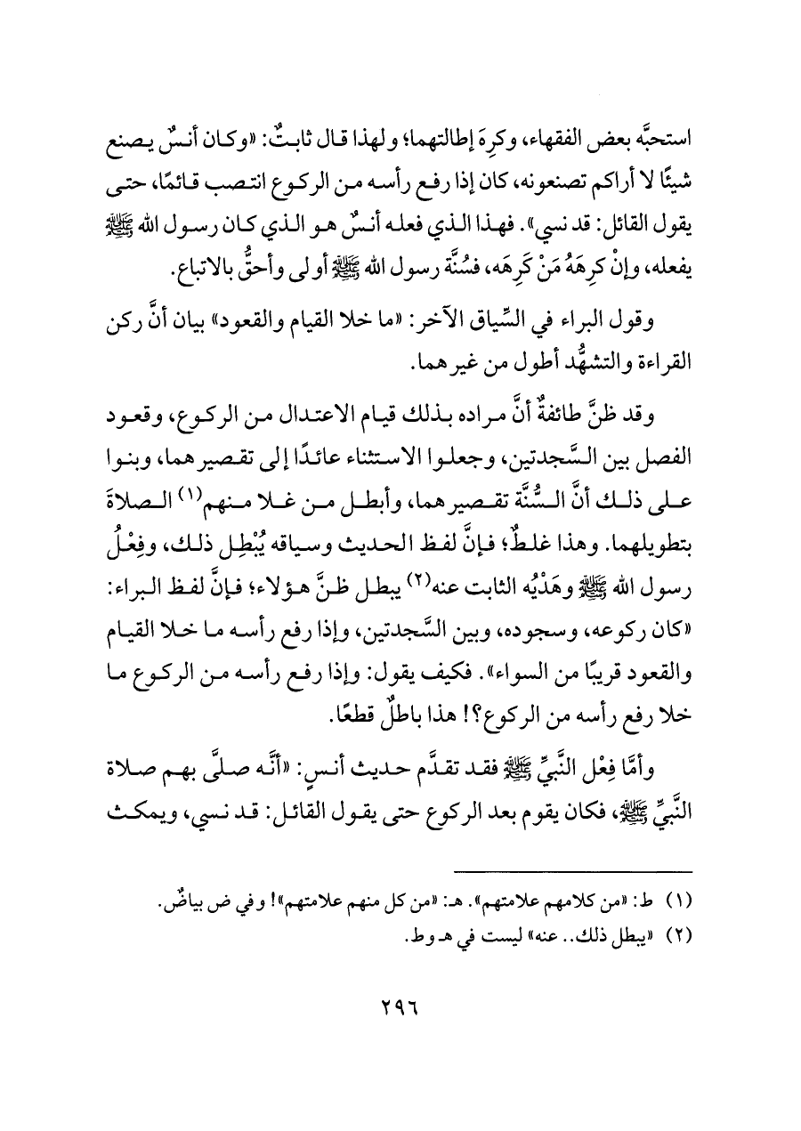 وقد ظنَّ طائفةٌ أنَّ مراده بذلك قيام الاعتدال من الركوع، وقعود الفصل بين السَّجدتين، وجعلوا الاستثناء عائدًا إلى تقصيرهما، وبنوا على ذلك أنَّ السُّنَّة تقصيرهما، وأبطل من غلا منهم (¬١) الصلاةَ بتطويلهما. وهذا غلطٌ؛ فإنَّ لفظ الحديث وسياقه يُبْطِل ذلك، وفِعْلُ رسول الله - صلى الله عليه وسلم - وهَدْيُه الثابت عنه (¬٢) يبطل ظنَّ هؤلاء؛ فإنَّ لفظ البراء: «كان ركوعه، وسجوده، وبين السَّجدتين، وإذا رفع رأسه ما خلا القيام والقعود قريبًا من السواء». فكيف يقول: وإذا رفع رأسه من الركوع ما خلا رفع رأسه من الركوع؟! هذا باطلٌ قطعًا.