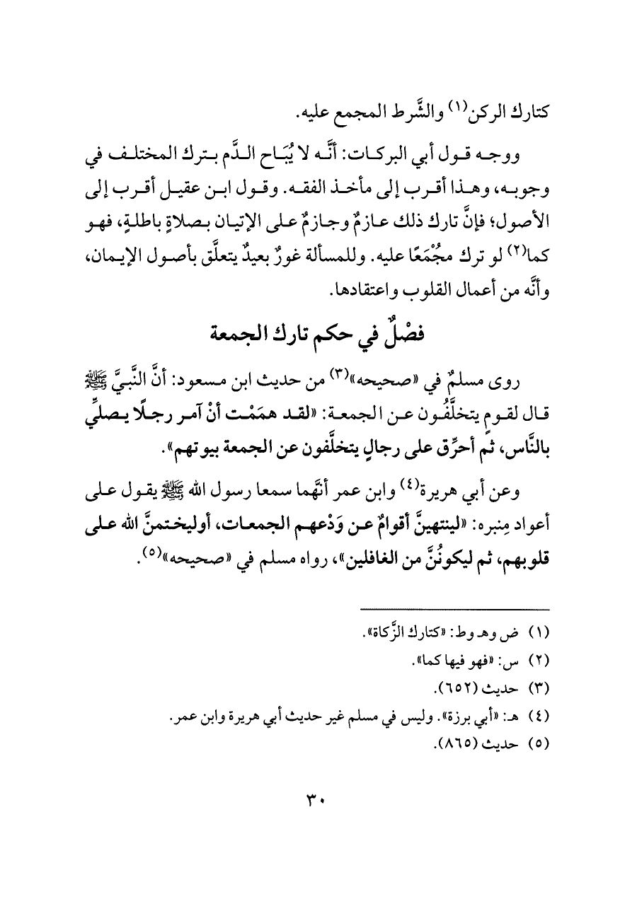 وعن أبي هريرة (¬٤) وابن عمر أنَّهما سمعا رسول الله - صلى الله عليه وسلم - يقول على أعواد مِنبره: "لينتهينَّ أقوامٌ عن وَدْعهم الجمعات، أوليختمنَّ الله على قلوبهم، ثم ليكونُنَّ من الغافلين"، رواه مسلم في "صحيحه" (¬٥).