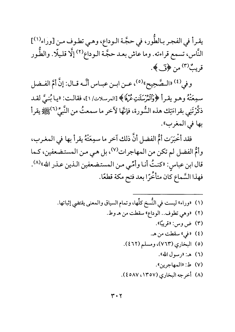 فقد أخْبَرَت أمُّ الفضل أنَّ ذلك آخر ما سمِعَتْهُ يقرأ بها في المغرب، وأمُّ الفضل لم تكن من المهاجرات (¬٧)، بل هي من المستضعفين، كما قال ابن عباسٍ: «كنتُ أنا وأمِّي من المستضعفين الذين عذر الله» (¬٨). فهذا السَّماع كان متأخِّرًا بعد فتح مكة قطعًا.
