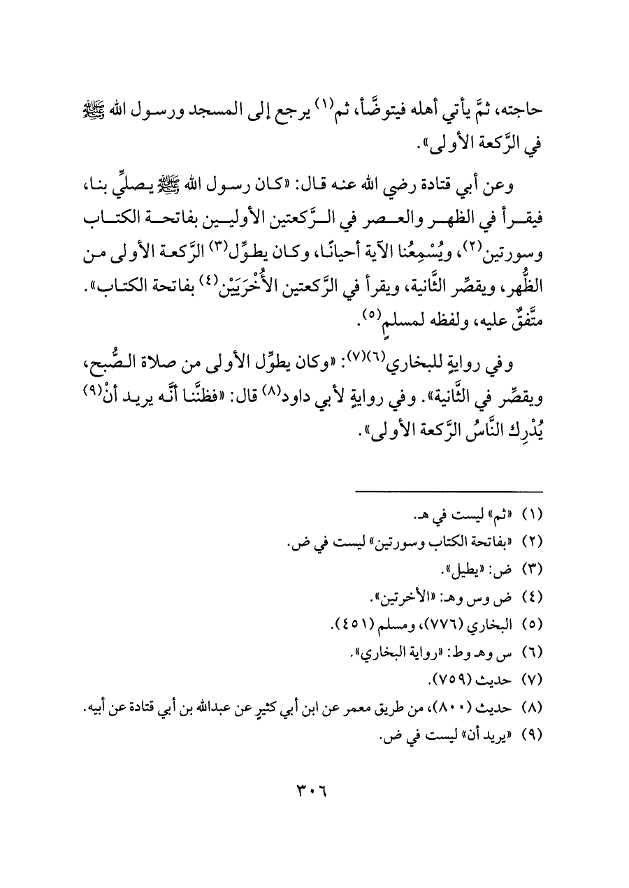وعن أبي قتادة رضي الله عنه قال: «كان رسول الله - صلى الله عليه وسلم - يصلِّي بنا، فيقرأ في الظهر والعصر في الرَّكعتين الأوليين بفاتحة الكتاب وسورتين (¬٢)، ويُسْمِعُنا الآية أحيانًا، وكان يطوِّل (¬٣) الرَّكعة الأولى من الظُّهر، ويقصِّر الثَّانية، ويقرأ في الرَّكعتين الأُخْرَيَيْن (¬٤) بفاتحة الكتاب». متَّفقٌ عليه، ولفظه لمسلمٍ (¬٥).