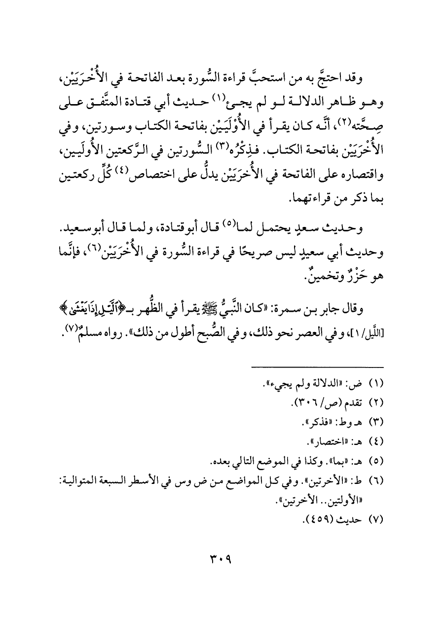وحديث سعدٍ يحتمل لما (¬٥) قال أبوقتادة، ولما قال أبوسعيد. وحديث أبي سعيدٍ ليس صريحًا في قراءة السُّورة في الأُخْرَيَيْن (¬٦)، فإنَّما هو حَزْرٌ و تخمينٌ.