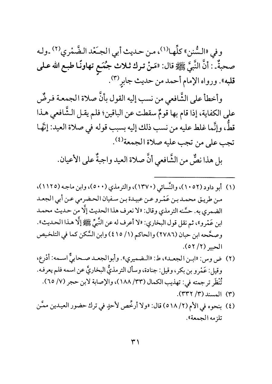 وفي "السُّنن" كلِّها (¬١)، من حديث أبي الجَعْد الضَّمْري (¬٢) ـ وله صحبةٌ ـ: أنَّ النَّبيَّ - صلى الله عليه وسلم - قال: "مَنْ ترك ثلاث جُمَعٍ تهاونًا طبع الله على قلبه". ورواه الإمام أحمد من حديث جابرٍ (¬٣).