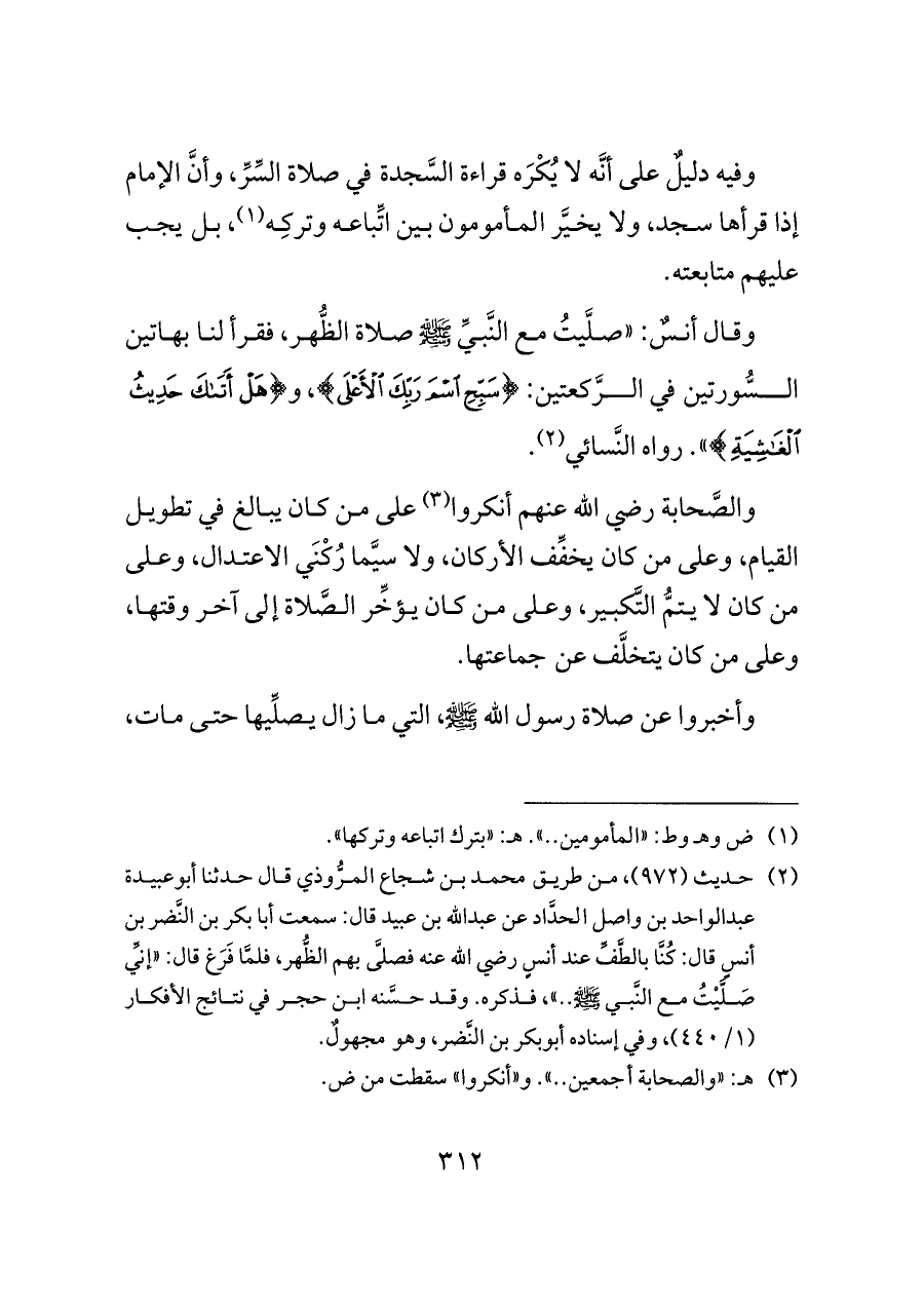 وقال أنسٌ: «صلَّيتُ مع النَّبيِّ - صلى الله عليه وسلم - صلاة الظُّهر، فقرأ لنا بهاتين السُّورتين في الرَّكعتين: {سَبِّحِ اسْمَ رَبِّكَ الْأَعْلَى}، و {هَلْ أَتَاكَ حَدِيثُ الْغَاشِيَةِ}». رواه النَّسائي (¬٢).