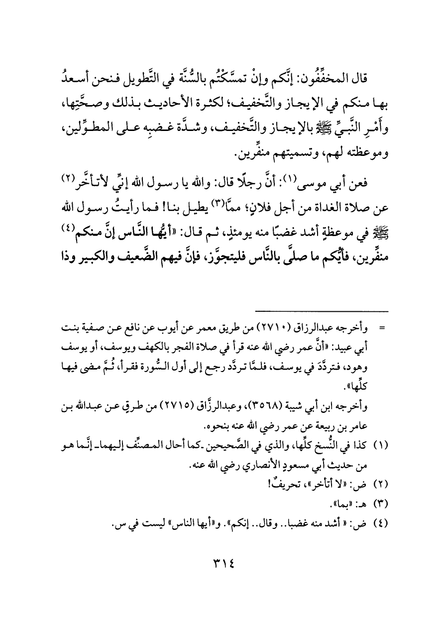 فعن أبي موسى (¬١): أنَّ رجلًا قال: والله يا رسول الله إنِّي لأتأخَّر (¬٢) عن صلاة الغداة من أجل فلانٍ؛ ممَّا (¬٣) يطيل بنا! فما رأيتُ رسول الله - صلى الله عليه وسلم - في موعظةٍ أشد غضبًا منه يومئذٍ، ثم قال: «أيُّها النَّاس إنَّ منكم (¬٤) منفِّرين، فأيُّكم ما صلَّى بالنَّاس فليتجوَّز، فإنَّ فيهم الضَّعيف والكبير وذا