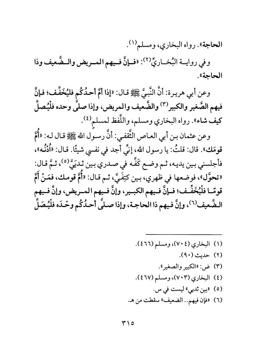 وعن عثمان بن أبي العاص الثَّقفي: أنَّ رسول الله - صلى الله عليه وسلم - قال له: «أُمَّ قومَك». قال: قلتُ: يا رسول الله، إنِّي أجد في نفسي شيئًا. قال: «اُدْنُه»، فأجلسني بين يديه، ثم وضع كَفَّه في صدري بين ثديَيَّ (¬٥)، ثمَّ قال: «تحوَّل»، فوضعها في ظهري، بين كتِفَيَّ، ثم قال: «أُمَّ قومك، فمَنْ أَمَّ قومًا فلْيُخَفِّف؛ فإنَّ فيهم الكبير، وإنَّ فيهم المريض، وإنَّ فيهم الضَّعيف (¬٦)، وإنَّ فيهم ذا الحاجة، وإذا صلَّى أحدُكُم وحْدَه فلْيُصَلِّ