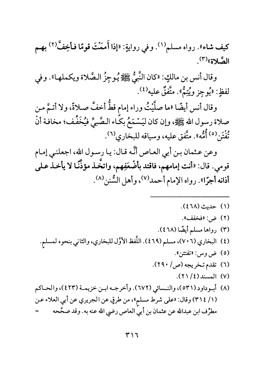 كيف شاء». رواه مسلم (¬١). وفي روايةٍ: «إذا أَمَمْتَ قومًا فأخِفَّ (¬٢) بهم الصَّلاة» (¬٣).
