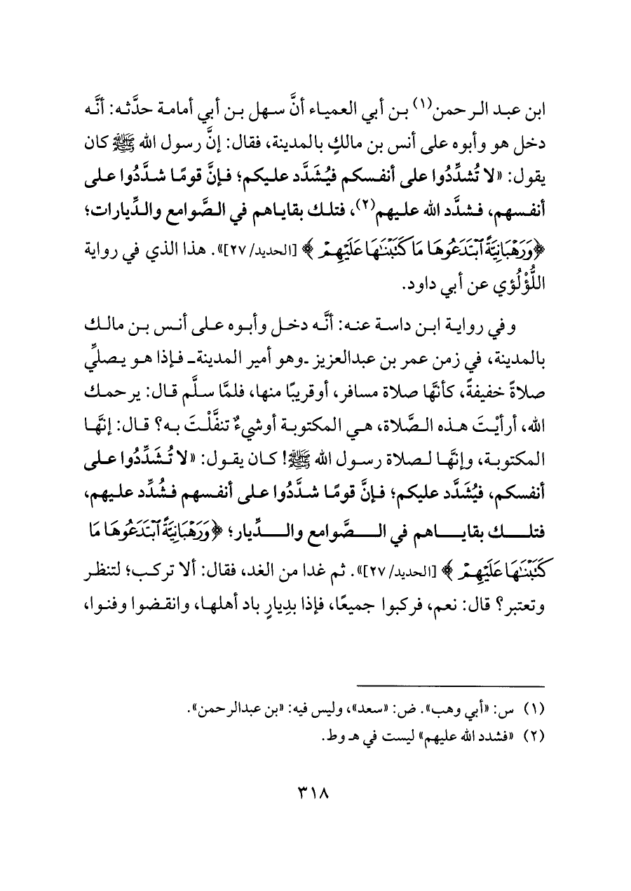 ابن عبد الرحمن (¬١) بن أبي العمياء أنَّ سهل بن أبي أمامة حدَّثه: أنَّه دخل هو وأبوه على أنس بن مالكٍ بالمدينة، فقال: إنَّ رسول الله - صلى الله عليه وسلم - كان يقول: «لا تُشدِّدُوا على أنفسكم فيُشَدَّد عليكم؛ فإنَّ قومًا شدَّدُوا على أنفسهم، فشدَّد الله عليهم (¬٢)، فتلك بقاياهم في الصَّوامع والدِّيارات؛ {وَرَهْبَانِيَّةً ابْتَدَعُوهَا مَا كَتَبْنَاهَا عَلَيْهِمْ} [الحديد/٢٧]». هذا الذي في رواية اللُّؤْلُؤي عن أبي داود.