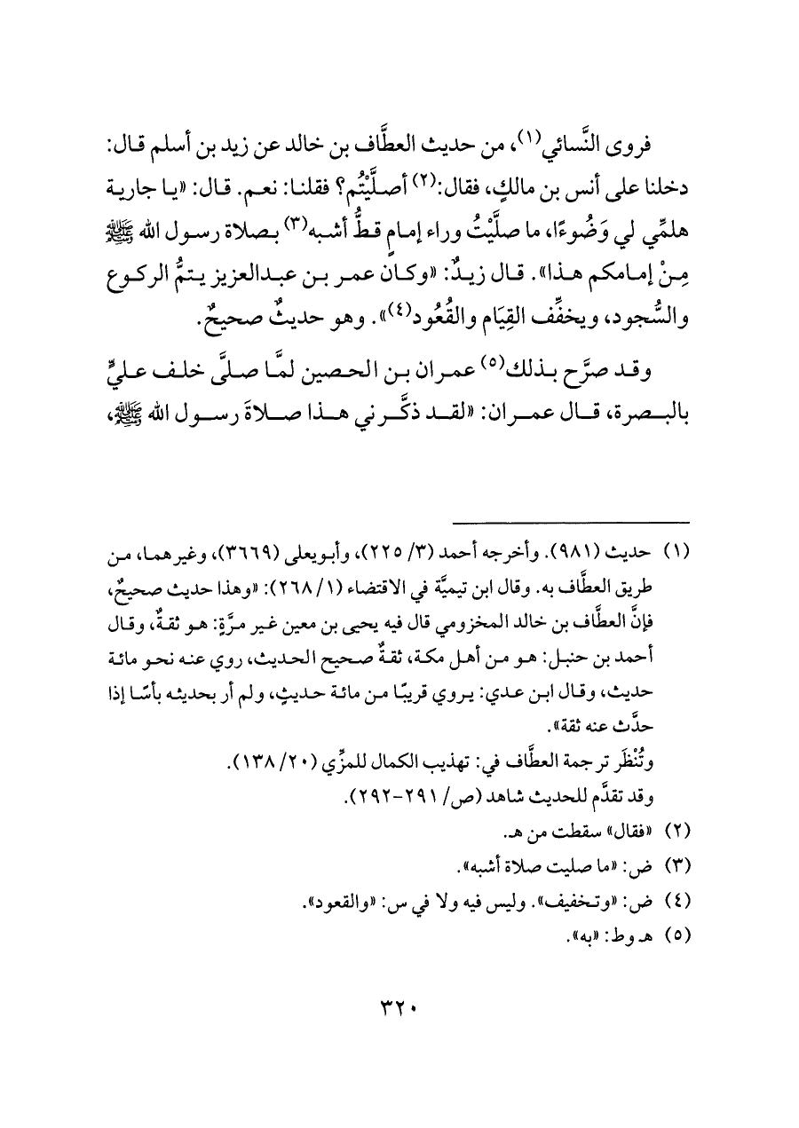 فروى النَّسائي (¬١)، من حديث العطَّاف بن خالد عن زيد بن أسلم قال: دخلنا على أنس بن مالكٍ، فقال: (¬٢) أصلَّيْتُم؟ فقلنا: نعم. قال: «يا جارية هلمِّي لي وَضُوءًا، ما صلَّيْتُ وراء إمامٍ قطُّ أشبه (¬٣) بصلاة رسول الله - صلى الله عليه وسلم - مِنْ إمامكم هذا». قال زيدٌ: «وكان عمر بن عبدالعزيز يتمُّ الركوع والسُّجود، ويخفِّف القِيَام والقُعُود (¬٤)». وهو حديثٌ صحيحٌ.