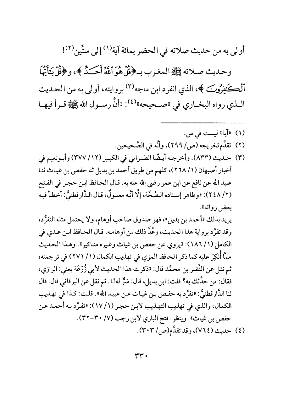وحديث صلاته - صلى الله عليه وسلم - المغرب بـ {قُلْ هُوَ اللَّهُ أَحَدٌ}، و {قُلْ يَاأَيُّهَا الْكَافِرُونَ}، الذي انفرد ابن ماجه (¬٣) بروايته، أولى به من الحديث الذي رواه البخاري في «صحيحه» (¬٤): «أنَّ رسول الله - صلى الله عليه وسلم - قرأ فيها