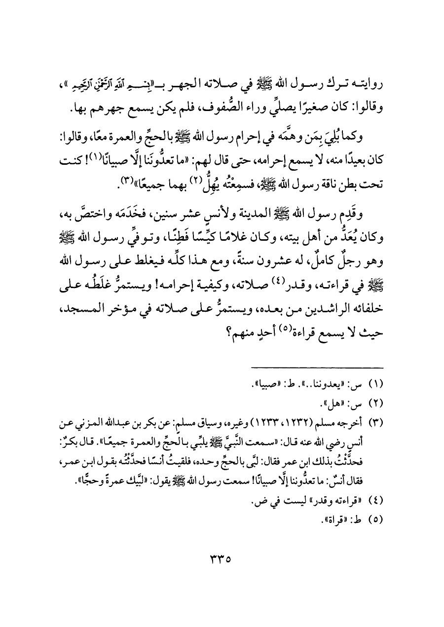 (¬٣) أخرجه مسلم (١٢٣٢، ١٢٣٣) وغيره، وسياق مسلمٍ: عن بكر بن عبدالله المزني عن أنسٍ رضي الله عنه قال: «سمعت النَّبيَّ - صلى الله عليه وسلم - يلبِّي بالحجِّ والعمرة جميعًا». قال بكرٌ: فحدَّثْتُ بذلك ابن عمر فقال: لبَّى بالحجِّ وحده، فلقيتُ أنسًا فحدَّثْتُه بقول ابن عمر، فقال أنسٌ: ما تعدُّوننا إلَّا صبيانًا! سمعت رسول الله - صلى الله عليه وسلم - يقول: «لبَّيك عمرةً وحجًّا».