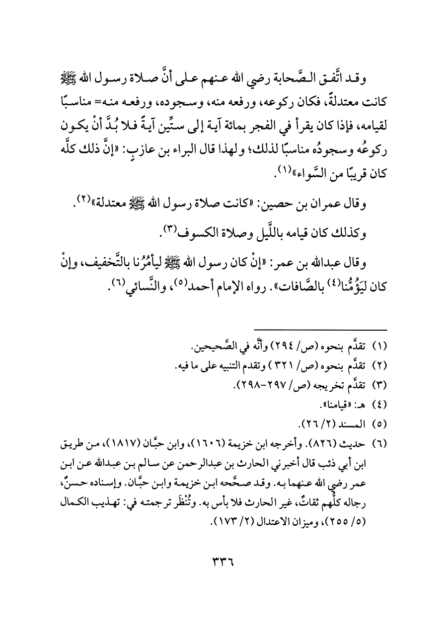 وقال عمران بن حصين: «كانت صلاة رسول الله - صلى الله عليه وسلم - معتدلة» (¬٢).