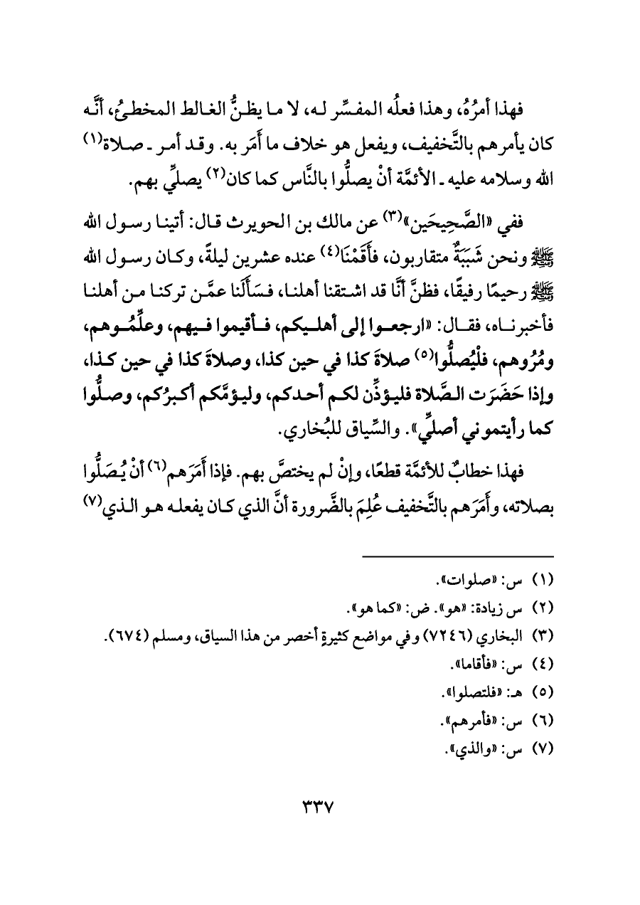 فهذا أمرُهُ، وهذا فعلُه المفسِّر له، لا ما يظنُّ الغالط المخطئُ، أنَّه كان يأمرهم بالتَّخفيف، ويفعل هو خلاف ما أَمَر به. وقد أمر ـ صلاة (¬١) الله وسلامه عليه ـ الأئمَّة أنْ يصلُّوا بالنَّاس كما كان (¬٢) يصلِّي بهم.