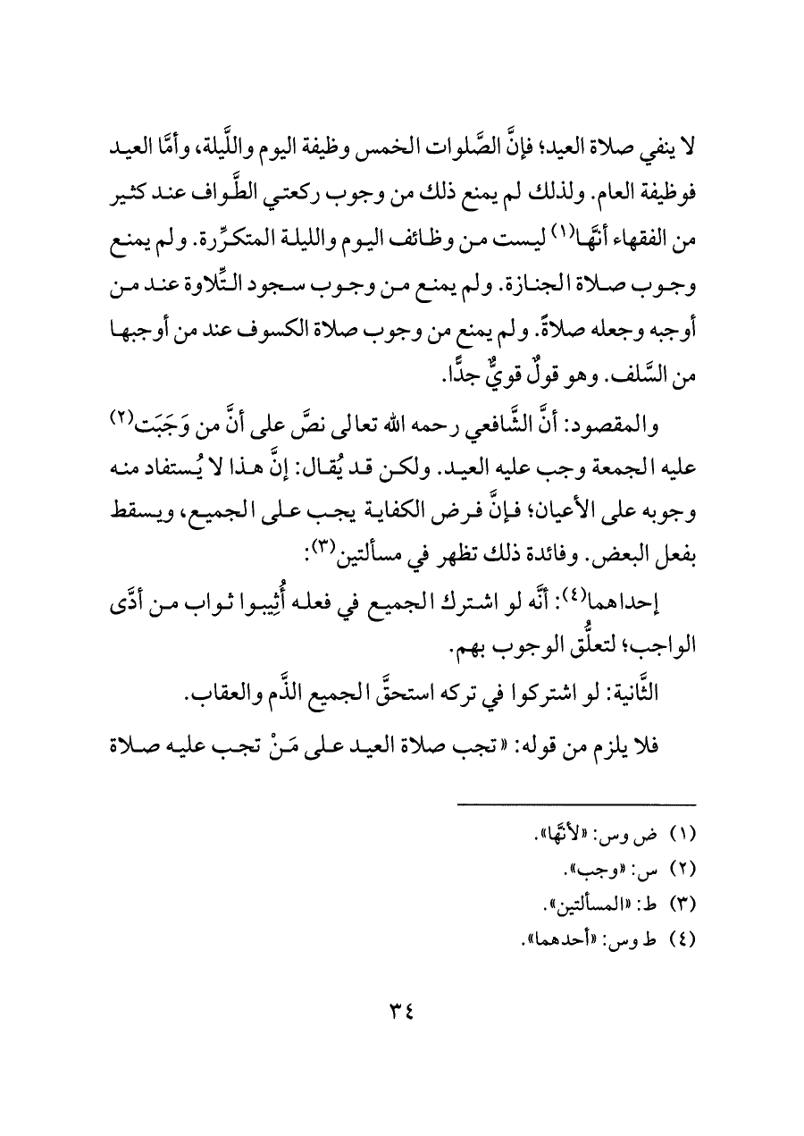 والمقصود: أنَّ الشَّافعي رحمه الله تعالى نصَّ على أنَّ من وَجَبَت (¬٢) عليه الجمعة وجب عليه العيد. ولكن قد يُقال: إنَّ هذا لا يُستفاد منه وجوبه على الأعيان؛ فإنَّ فرض الكفاية يجب على الجميع، ويسقط بفعل البعض. وفائدة ذلك تظهر في مسألتين (¬٣):