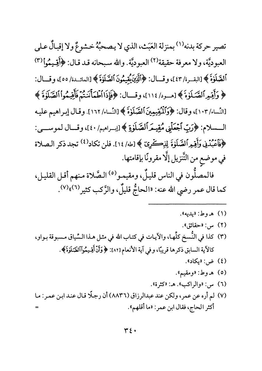 تصير حركة بدنه (¬١) بمنزلة العَبَث، الذي لا يصحبُهُ خشوعٌ ولا إقبالٌ على العبوديَّة، ولا معرفة حقيقة (¬٢) العبوديَّة. والله سبحانه قد قال: {أَقِيمُوا (¬٣) الصَّلَاةَ} [البقرة/٤٣]، وقال: {الَّذِينَ يُقِيمُونَ الصَّلَاةَ} [المائدة/٥٥]، وقال: {وَأَقِمِ الصَّلَاةَ} [هود/١١٤]، وقال: {فَإِذَا اطْمَأْنَنْتُمْ فَأَقِيمُوا الصَّلَاةَ} [النِّساء/١٠٣]، وقال: {وَالْمُقِيمِينَ الصَّلَاةَ} [النِّساء/١٦٢]. وقال إبراهيم عليه السلام: {رَبِّ اجْعَلْنِي مُقِيمَ الصَّلَاةِ} [إبراهيم/٤٠]، وقال لموسى: {فَاعْبُدْنِي وَأَقِمِ الصَّلَاةَ لِذِكْرِي} [طه/١٤]. فلن تكاد (¬٤) تجد ذكر الصلاة في موضعٍ من التَّنزيل إلَّا مقرونًا بإقامتها.