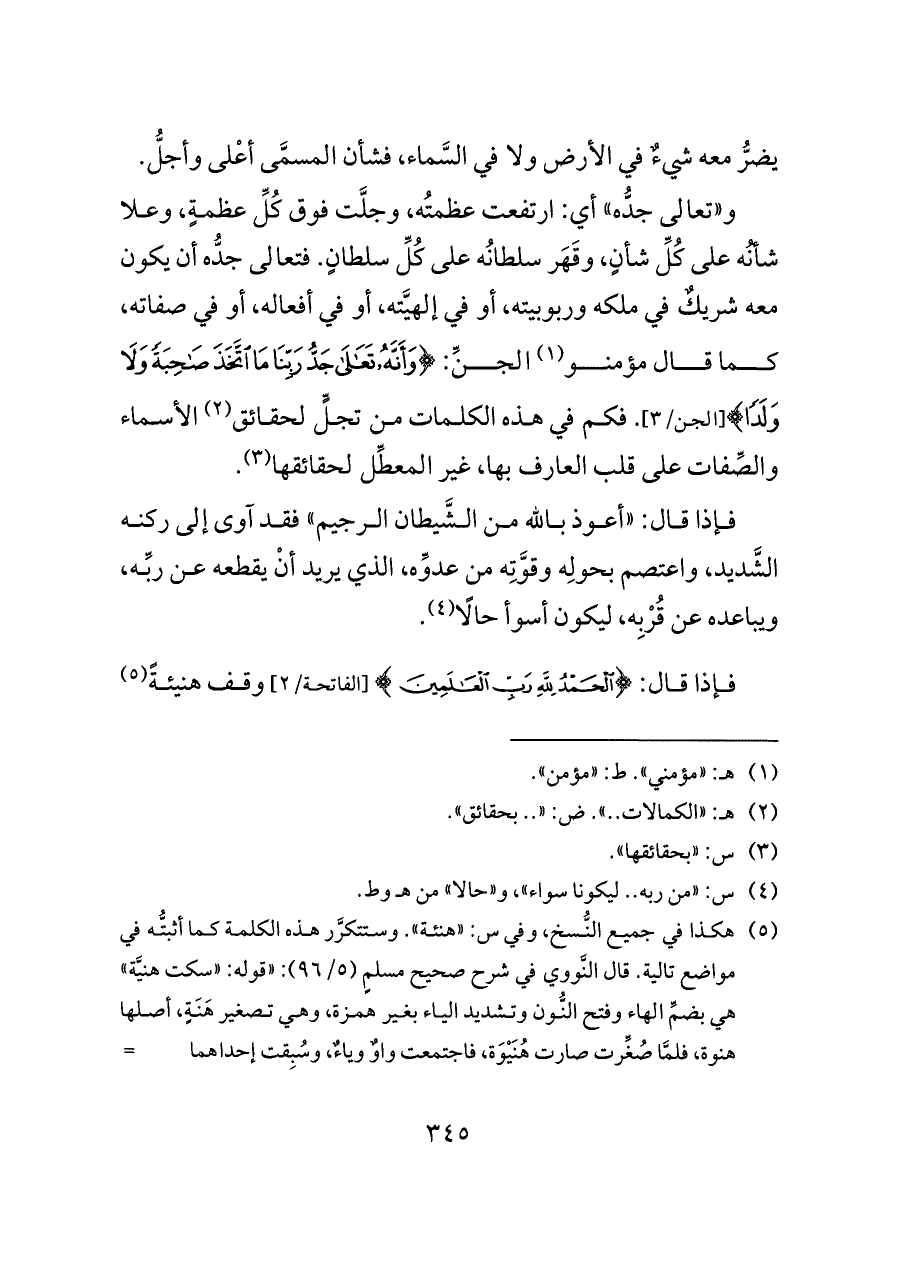 (¬٥) هكذا في جميع النُّسخ، وفي س: «هنئة». وستتكرَّر هذه الكلمة كما أثبتُّه في مواضع تالية. قال النَّووي في شرح صحيح مسلمٍ (٥/ ٩٦): «قوله: «سكت هنيَّة» هي بضمِّ الهاء وفتح النُّون وتشديد الياء بغير همزة، وهي تصغير هَنَةٍ، أصلها هنوة، فلمَّا صُغِّرت صارت هُنَيْوَة، فاجتمعت واوٌ وياءٌ، وسُبِقت إحداهما ... =