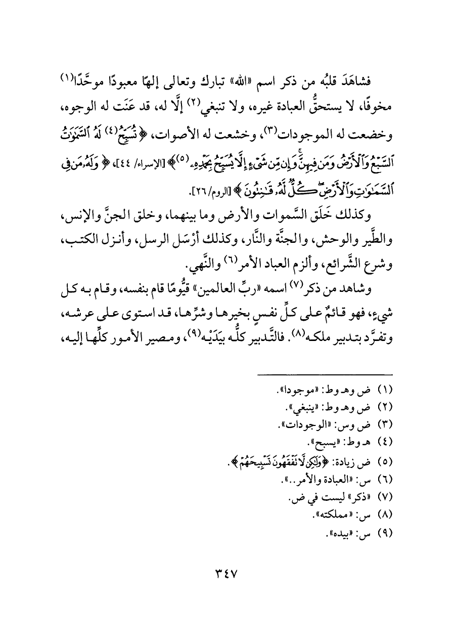 فشاهَدَ قلبُه من ذكر اسم «الله» تبارك وتعالى إلهًا معبودًا موحَّدًا (¬١) مخوفًا، لا يستحقُّ العبادة غيره، ولا تنبغي (¬٢) إلَّا له، قد عَنَت له الوجوه، وخضعت له الموجودات (¬٣)، وخشعت له الأصوات، {تُسَبِّحُ (¬٤) لَهُ السَّمَاوَاتُ السَّبْعُ وَالْأَرْضُ وَمَنْ فِيهِنَّ وَإِنْ مِنْ شَيْءٍ إِلَّا يُسَبِّحُ بِحَمْدِهِ (¬٥)} [الإسراء/ ٤٤]، {وَلَهُ مَنْ فِي السَّمَاوَاتِ وَالْأَرْضِ كُلٌّ لَهُ قَانِتُونَ} [الروم/٢٦].