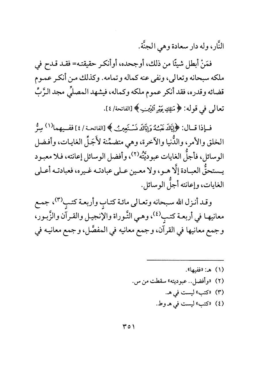 وقد أنزل الله سبحانه وتعالى مائة كتابٍ وأربعة كتبٍ (¬٣)، جمع معانيها في أربعة كتبٍ (¬٤)، وهي التَّوراة والإنجيل والقرآن والزَّبور، وجمع معانيها في القرآن، وجمع معانيه في المفصَّل، وجمع معانيه في