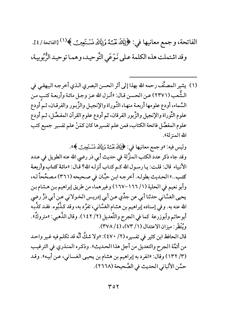 (¬١) يشير المصنِّف رحمه الله بهذا إلى أثر الحسن البصري الذي أخرجه البيهقي في الشُّعب (٢٣٧١) عن الحسن قال: «أنزل الله عز وجل مائة وأربعة كتبٍ من السَّماء، أودع علومها أربعة منها، التَّوراة والإنجيل والزَّبور والفرقان، ثم أودع علوم التَّوراة والإنجيل والزَّبور الفرقان، ثم أودع علوم القرآن المفصَّل، ثم أودع علوم المفصَّل فاتحة الكتاب، فمن علم تفسيرها كان كمَنْ علم تفسير جميع كتب الله المنزلة».