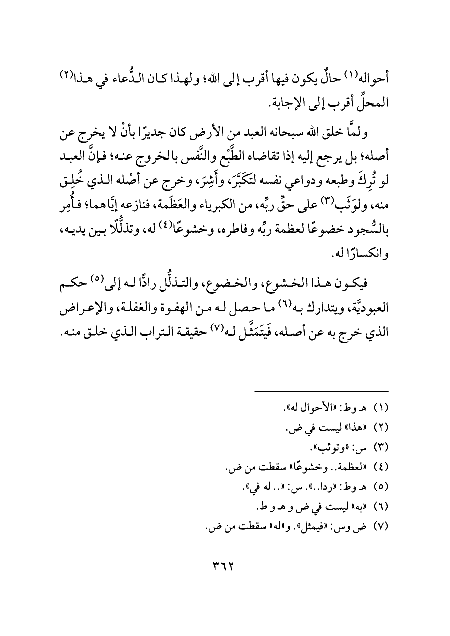 فيكون هذا الخشوع، والخضوع، والتذلُّل رادًّا له إلى (¬٥) حكم العبوديَّة، ويتدارك به (¬٦) ما حصل له من الهفوة والغفلة، والإعراض الذي خرج به عن أصله، فَيتَمَثَّل له (¬٧) حقيقة التراب الذي خلق منه.