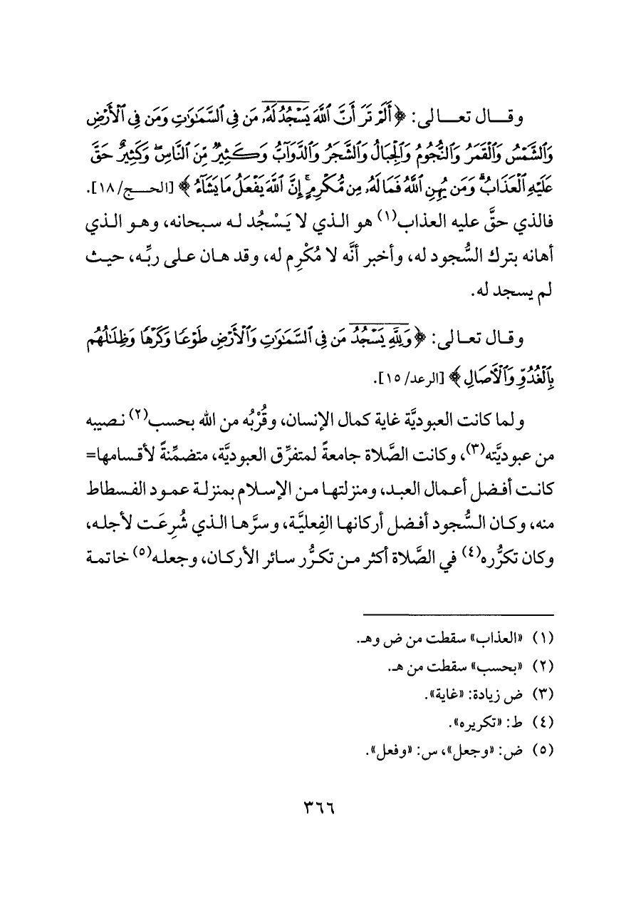 وقال تعالى: {أَلَمْ تَرَ أَنَّ اللَّهَ يَسْجُدُ لَهُ مَنْ فِي السَّمَاوَاتِ وَمَنْ فِي الْأَرْضِ وَالشَّمْسُ وَالْقَمَرُ وَالنُّجُومُ وَالْجِبَالُ وَالشَّجَرُ وَالدَّوَابُّ وَكَثِيرٌ مِنَ النَّاسِ وَكَثِيرٌ حَقَّ عَلَيْهِ الْعَذَابُ وَمَنْ يُهِنِ اللَّهُ فَمَا لَهُ مِنْ مُكْرِمٍ إِنَّ اللَّهَ يَفْعَلُ مَا يَشَاءُ} [الحج/١٨]. فالذي حقَّ عليه العذاب (¬١) هو الذي لا يَسْجُد له سبحانه، وهو الذي أهانه بترك السُّجود له، وأخبر أنَّه لا مُكْرِم له، وقد هان على ربِّه، حيث لم يسجد له.