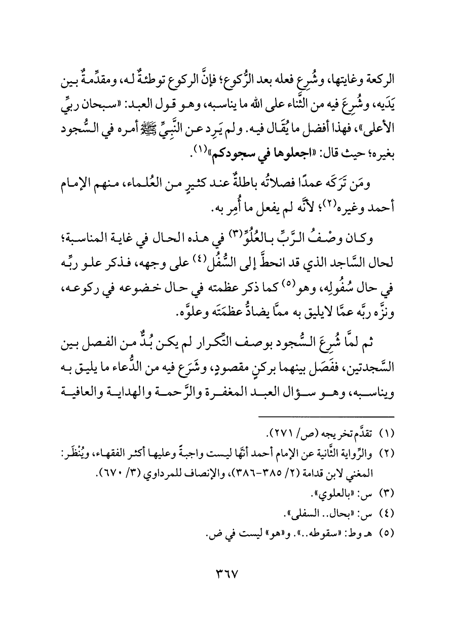 وكان وصْفُ الرَّبِّ بالعُلُوِّ (¬٣) في هذه الحال في غاية المناسبة؛ لحال السَّاجد الذي قد انحطَّ إلى السُّفُل (¬٤) على وجهه، فذكر علو ربِّه في حال سُفُولِه، وهو (¬٥) كما ذكر عظمته في حال خضوعه في ركوعه، ونزَّه ربَّه عمَّا لايليق به ممَّا يضادُّ عظمَتَه وعلوَّه.