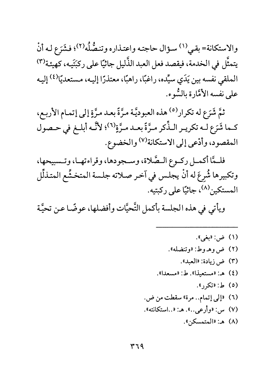 فلمَّا أكمل ركوع الصَّلاة، وسجودها، وقراءتها، وتسبيحها، وتكبيرها شُرِعَ له أنْ يجلس في آخر صلاته جلسة المتخشِّع المتذلِّل المستكين (¬٨)، جاثيًا على ركبتيه.