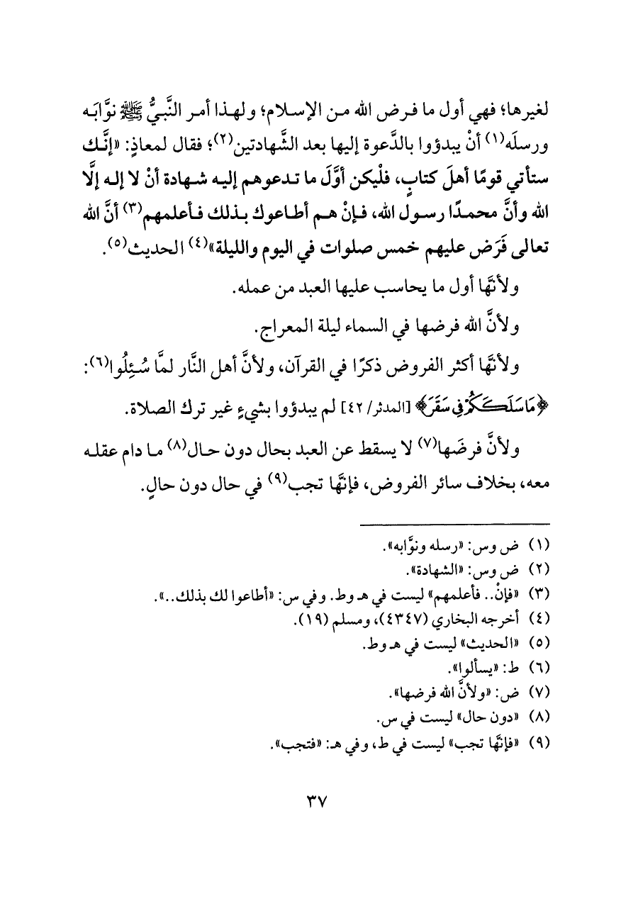 لغيرها؛ فهي أول ما فرض الله من الإسلام؛ ولهذا أمر النَّبيُّ - صلى الله عليه وسلم - نوَّابَه ورسلَه (¬١) أنْ يبدؤوا بالدَّعوة إليها بعد الشَّهادتين (¬٢)؛ فقال لمعاذٍ: "إنَّك ستأتي قومًا أهلَ كتابٍ، فلْيكن أوَّلَ ما تدعوهم إليه شهادة أنْ لا إله إلَّا الله وأنَّ محمدًا رسول الله، فإنْ هم أطاعوك بذلك فأعلمهم (¬٣) أنَّ الله تعالى فَرَض عليهم خمس صلوات في اليوم والليلة" (¬٤) الحديث (¬٥).