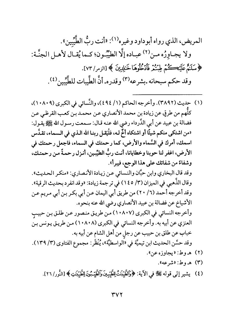 (¬١) حديث (٣٨٩٢). وأخرجه الحاكم (١/ ٤٩٤)، والنَّسائي في الكبرى (١٠٨٠٩)، كلُّهم من طرقٍ عن زيادة بن محمد الأنصاري عن محمد بن كعب القرظي عن فضالة بن عبيد عن أبي الدَّرداء رضي الله عنه قال: سمعت رسول الله - صلى الله عليه وسلم - يقول: «من اشتكى منكم شيئًا أو اشتكاه أخٌ له، فلْيَقل ربنا الله الذي في السماء، تقدَّس اسمك، أمرك في السَّماء والأرض، كما رحمتك في السماء، فاجعل رحمتك في الأرض، اغفر لنا حوبنا وخطايانا، أنت ربُّ الطيِّبين، أنزل رحمةً من رحمتك، وشفاءً من شفائك على هذا الوجع، فيبرأ».